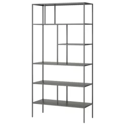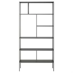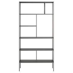 Showcase your favorite books and decorative items with this 72″ bookcase. Crafted from steel, it strikes a clean-lined silhouette that’s equally at home in a contemporary living room or industrial home office. It boasts a neutral metallic finish and staggered metal shelves for a look that blends with nearly any color palette.Features : Frame and shelves are made of steel.Tip-restraint kit included for safety.Middle shelves have a weight capacity of 40 lbs each. The bottom shelf can hold 50 lbs.Clean with a soft, dry cloth; no harsh chemicals or abrasive cleaning materials.Features easy assembly.Specifications : Product Dimensions : 15″ x 36″ x 72″Product Weight : 54.45 lbs