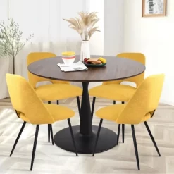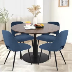 Harold+Edwin 5-Piece Walnut Foil Round Top Pedestal Dining Table Set With 4 Upholstered Chairs -The Pop Maison