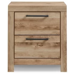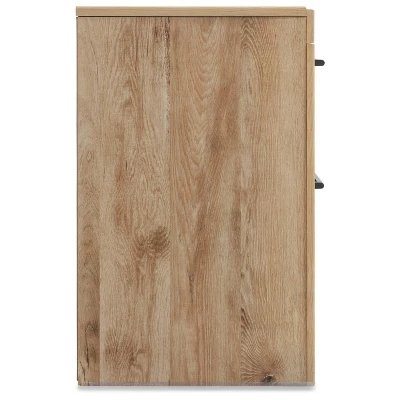 Inspired by natural beauty, refined to perfection. This nightstand brings cozy outdoor vibes to your bedroom with its warm and inviting golden rustic finish. Antiqued gunmetal handles adorn the two drawers on its framed front for an industrial touch, while USB charging adds a high-tech element to the simple, streamlined design. A nightstand, or bedside table, is an essential component in every bedroom. Whether you’re looking for a white nightstand, black nightstand or even a mirrored nightstand, Ashley has what you need to create the bedroom of your dreams. Signature Design by Ashley is a registered trademark of Ashley Furniture Industries, Inc..