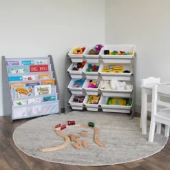 Playtime becomes more fun when your kids can easily take out their toys, books and games and then quickly clean up afterwards. The space-saving Humble Crew Toy Storage Organizer with 12 Storage Bins stows your children’s toys in easy-to-see, easy-to-access BPA and phthalate free plastic storage bins. 8 standard and 4 large storage containers are easy to remove, replace and reposition along the 4 tiered organizer shelves. Storage bins are sized just right within the toy organizer for toddlers and preschool aged children. Contoured sturdy engineered wood construction frame with stabilizing braces and steel shelving rods, 20 pound weight capacity per level. Some assembly is required. A great toy storage box alternative; helping keep your little one’s room clean and organized while at the same time teaching color identification, sorting and cognitive skills. Perfect organizational solution for bedrooms, playrooms and bathrooms.