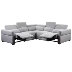 A modern motion set with clean lines, Isla packs both style and function into a Sectional that is also built for comfort. Upholstered in a pale, gray tweed fabric, this dual-power set features an elevated headrest that stores away flat when not in use and both seats recline in both the right arm and left arm loveseats. The inside arm control panels feature a USB charging port and home button to return the recliners to their closed position. The sectional includes one left arm facing reclining loveseat, one right arm facing reclining loveseat and one sectional wedge with storage.