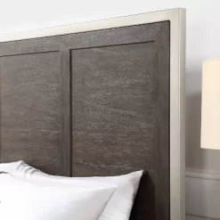 With a modern take on transitional styling, the Broomfield king platform bed is a study in simplicity with clean lines and an elegant mix of materials. A warm walnut finish beautifully complements the champagne trim surrounding the tall panel headboard and sled style footboard. Requires mattress only – sold separately. Your purchase includes (1) platform bed.