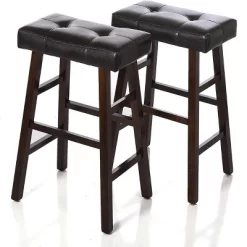 These Espresso/Brown Counter height Bar Stools will add stylish seating to any counter height table in your home. The sturdy wood frame has an espresso finish accented by an espresso faux leather upholstered tufted seat. The double needle stitching adds durability to the padded top for eye-catching detail. Set of 2 same height stools. You can select the seat height that fits your table. 24β High seat is for Counter Height seating.