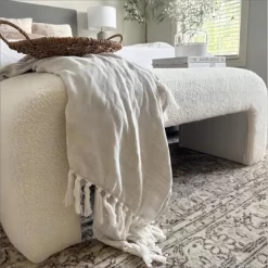 Prepare to be captivated by our Boucle Waterfall Bench, a true embodiment of personality and style. This fully upholstered bench is designed to make a bold statement in any room it graces. The exquisite texture of the boucle fabric, combined with the alluring waterfall shape, creates a visually stunning piece that demands attention.In a soothing cream color, this bench seamlessly blends into any setting, effortlessly transitioning from the bedroom to the living room or hallway. Its tonal and inviting neutral hue adds a touch of elegance and versatility to your home decor.Crafted with a solid wood frame, this bench boasts superior thickness and strength, ensuring its durability and stability. It comfortably accommodates two people, providing a cozy seating option that surpasses the quality of cheaply made alternatives found in the market.