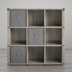 - 9 storage cubbies with 3 locker style fabric bins with metal fronts