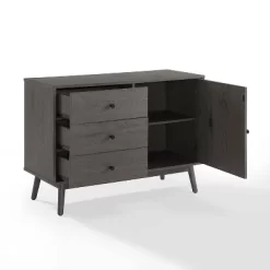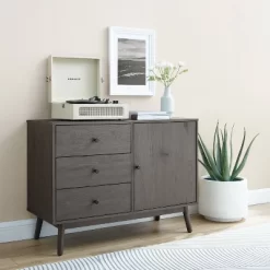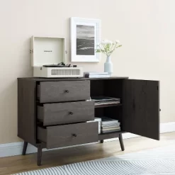 Stay organized in mid-century modern style with the Lucas Media Console. Featuring a large cabinet with an adjustable shelf, you can store everything from books and board games to dishes and flatware. With three large storage drawers, this console keeps smaller items organized and out of sight. The Lucas Media Console has clean lines and a simple design that complement any room in your home. OVERALL PRODUCT DIMENSIONS: 40”W X 15.75”D X 29”H