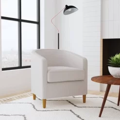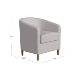 With a rounded barrel silhouette, this modern accent chair will ramp up the style in any space. Use it as a reading chair in the bedroom, as a side chair in the living room, or as an occasional chair in the home office. For maximum impact, pair two together and enjoy the striking results. It rests on four cone shaped legs with a honey oak finish. This modern barrel chair is easy to assemble and maintain.