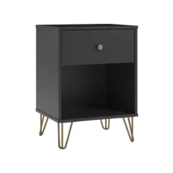Bring some retro flair to your bedside with the Novogratz Owen Nightstand. The black finish on the laminated particleboard contrasts the gold accents for a fun look for your Nightstand. The drawer and shelf will give you plenty of room for bedside storage. Finish your room with the entire Owen collection for a coordinated look (each sold separately)
