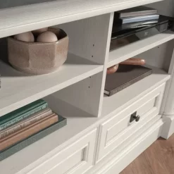Furnish your home with floor space in mind with this corner credenza from the Palladia® collection. This corner TV stand accommodates up to a 60″ TV weighing 95 lbs. or less, making it the ideal spot to cozy up for a movie marathon with your friends. This entertainment credenza features two large adjustable shelves that have the ability to move to different heights to create flexible storage for items of all shapes and sizes, like your audio/video equipment and gaming console. Two adjustable corner display shelves provide a nook on each side to display home décor and more. This corner entertainment credenza also features two storage drawers that open and close on smooth metal runners for extra unused cables, remotes, controllers, and more. The enclosed back panel has cord access so you can keep wires neat and out of sight. Finished in Glacier Oak™ with Rosso Slate finish accent, this stunning corner media credenza is the small space solution for you!