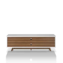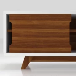 Flaunting a two-tone appearance and plenty of storage, this mid-century modern TV stand is equipped to enhance your entertainment area. Two sliding cabinet doors with cut-out grooves open to reveal shelving units inside. Easily conceal your media essentials for a clean and organized space, and enjoy accommodating your large TV of up to 72 inches.