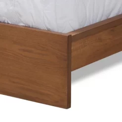 Outfit your bedroom with the modern convenience of the Sami bed. Made in Malaysia, the Sami is crafted from walnut brown finished wood and upholstered in smooth fabric for a cozy display. Two drawers on the sides provide secure bedside storage, while two elevated shelves create an eye-catching display for decorative items. Requiring assembly, the Sami is equipped with wood slats that eliminate the need for a box spring. Its low platform lends a chic, contemporary look, making the Sami bed is an excellent addition to the modern home.