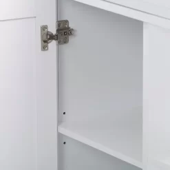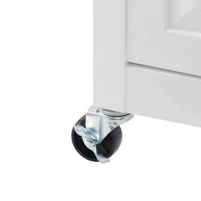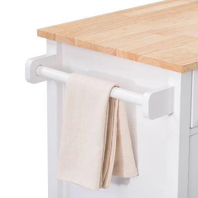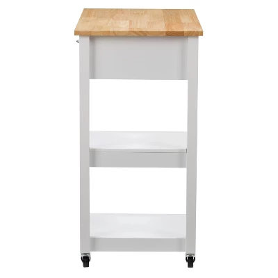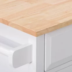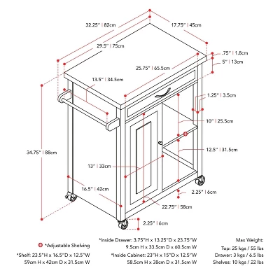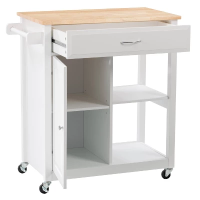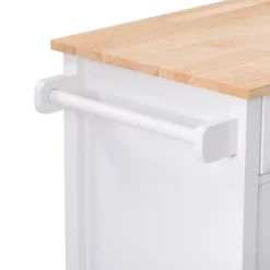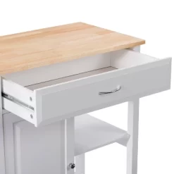Compact kitchen? No problem! Add extra space to work, serve, and stow away kitchen accessories with this must-have kitchen cart. Its frame is clean-lined and showcases a classic finish to fit in any home’s aesthetic. The top has a neutral wood grain finish and the pinewood legs are supported by four wheels with locking castors so your cart stays in the location of your choosing or can be moved at any time. With open and closed storage from the drawer to the cabinet, towel rack, and shelf you have ample space to keep all your kitchen necessities within arm’s reach. Product Dimensions: 35″H x 32″W x 18″D