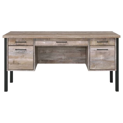 Infuse your office space with stylish simplicity. With a rustic, aged oak finish, this office desk exudes classic charm. Its strong silhouette is brought to life by crisp, clean lines of bold, black metal. Complete with five spacious storage and file drawers, this desk makes it easy to stay organized. Complete with euro glides and high-quality craftsmanship, it’s the ultimate in durable practicality.