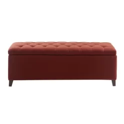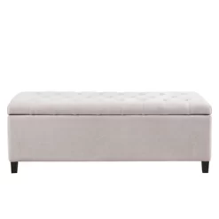 The Selah Tufted Top Storage Bench offers a sophisticated storage option that elevates your home decor. This accent bench come fully upholstered and features a button tufted top that adds a refined touch to the luxurious design. The solid wood legs showcase a dark wood finish that beautifully complements the upholstery, for an elegant transitional look. With ample storage space for blankets or other home essentials, this upholstered storage bench adds functionality and style to your bedroom or living room. Leg assembly is required and tools are included.