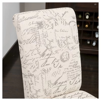 These Christopher Knight Home French Beige Printed Linen Dining Chairs (Set of 2) will add a unique flair to your dining space. Designed with French handwritten pattern over beige linen and espresso colored legs, you will be sure to get attention with these chairs. Add them to your existing dining table or place then in your living room or entertaining space to provide extra seating. These Christopher Knight Home French Beige Printed Linen Dining Chairs will be a conversation starter in your home.