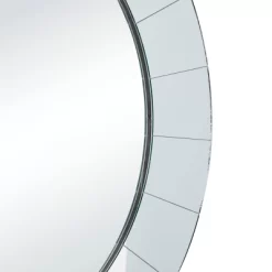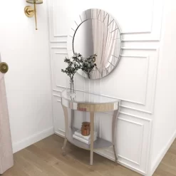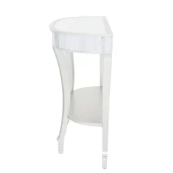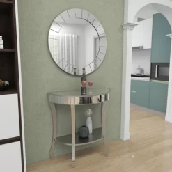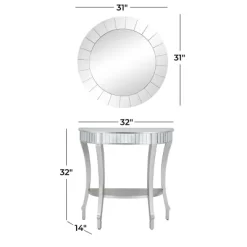 Bring a finishing touch to your home with an inviting appeal with this console table with mirror. Useful and elegant, console tables are more than just a place to throw your mail. Get organizing with this half circle console table and add a dash of sparkle to any of your home spaces. Designed with felt or rubber stoppers at the base that prevent scratching furniture and table tops, as well as sliding around. This item ships in 1 carton. Can be hung vertically using the D-rings on the back; nails and screws not included. Suitable for indoor use only. This item ships fully assembled in one piece. Maximum weight limit is 100 lbs. This silver colored entryway table with mirror comes as a set of 2. Wood console table with mirror features a single shelf. Glam style.
