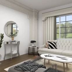 - •This glam console table is overlaid with mirrors and highlights a semi glossed silver finish