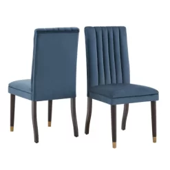 The Pruett Velvet Channel Back Dining Chairs (Set of 2) from Inspire Q updates your dining room with chic elegance. You guests will dine in total comfort, thanks to plush foam cushions upholstered in rich velvet. The high chair backs feature channel tufting for a clean-lined look. Founded on strong rubberwood legs, gold leg caps add a bold pop, completing the contemporary aesthetic.