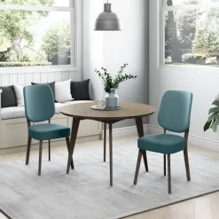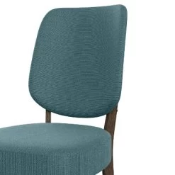 Classic and understated, this set of 2 armless dining chairs celebrates the clean lines and simple design elements of the mid-century modern movement. Covered in a linen-like Caribbean blue fabric, the gently rounded square backs and thickly cushioned foam seats provide comfortable support. Solid wood square legs flare out slightly for added style. Sturdily constructed of engineered wood for long-lasting durability.