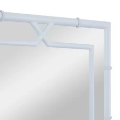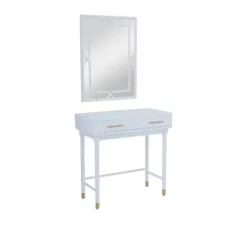- Showcases a smooth white pairing of a metal framed wall mirror with a chic rectangular console table that features an elongated drawer with two gold bar handles