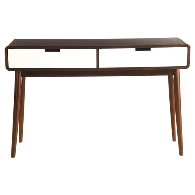 Complement your mid-century decor aesthetic with the storage and display space of the Walnut White Sofa Table from Acme Furniture. Tapered legs add retro flair as it supports a dark wood tabletop, offering stunning contrast against the two white drawers. This beautiful wood sofa table provides the perfect addition to your entryway or living room, adding extra hidden storage in the two drawers or space for displaying your favorite decor on the spacious top.