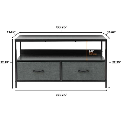 - SMART & STYLISH DESIGN ā Sleek wide storage ā Made with strong steel frame and durable MDF wood top with smooth finish ā Drawers made of breathable, non-woven fabric ā Wipe clean ā Minimal assembly required ā Hardware and instructions INCLUDED ā Middle Shelf 8.25ā Hā Entire Unit Approximately 38.75ā L x 11.50ā W x 22.25ā H