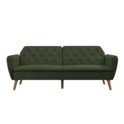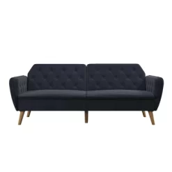 The Novogratz Tallulah Memory Foam Futon is exactly what you need. Bringing into your home elegance and sophistication with a vintage silhouette, rounded lines and button-tufted details in soft velvet upholstery, this piece is compact and multi-functional. Made on a sturdy wood frame, Tallulah is designed to offer nothing but superior comfort. The seats are filled with high-density foam and responsive memory foam that will cradle your body and relieve pressure points while you are watching TV or taking afternoon naps. The backrest features a split-back that can be independently reclined to create multiple positions, including lounging and sleeping. This means you now have an extra bed for overnight guests! Available in multiple colors, this chic and stylish piece is finished with slanted wooden legs.