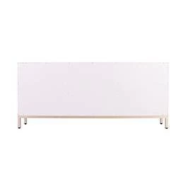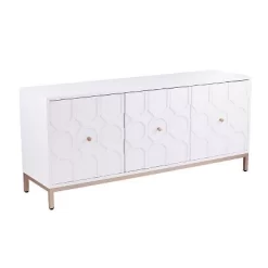 Shelve clutter with the Aiden Lane Gramden Antique White Three-Door Accent Cabinet. Adjustable shelves tuck away dishes and glassware in the dining room or media and electronics in the den, while carved doors keep odds and ends out of sight. The metal base adds a pop of contrasting color, while the low-profile design slides easily beneath your wall-mounted TV. Organization comes first with this versatile credenza anchoring your entryway, living room, or open concept space.