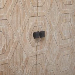 - •Wooden brown cabinet is chiseled and carved intricately to create hexagonal-shaped patterns