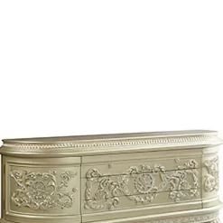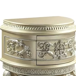 The Vatican Bedroom Collection employs a sense of timeless style in each piece, from button-tufted upholstery, scrolled floral accents to detailed design. Padded headboard and footboard showcase classic arched-silhouettes that are graced with crown, scrolled trims, and ornate engravings. Champagne gold-tone lends a sleek finishing touch to matching case goods. The Vatican Collection will infuse your bedroom with glitter and endless luxury.