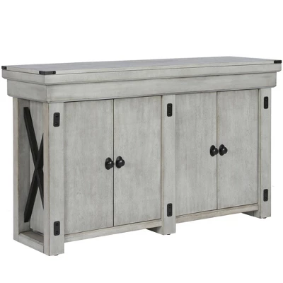 - The stand is crafted from a weathered white wood veneer and has laminated particleboard with dark gray metal hardware accents to make it a sleek design to fit into any rustic, transitional or shabby chic living space