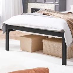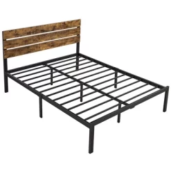 - Crafted from premium iron in a black finish, this bed frame has a clean silhouette and is completed with an open horizontal bar headboard. The combination of metal slats and a wooden headboard brings a sleek but warm accent to your home. Constructed with a slatted structure, the bed base is sturdy and reliable for every restful night. The headboard is made of CARB P2-compliant MDF boards for your family’s health. A spacious room under the bed helps to expand the limited storage space in your bedroom. This bed frame will perfectly fit in the bedroom, guest room, apartment, and more.