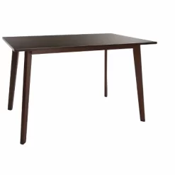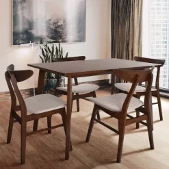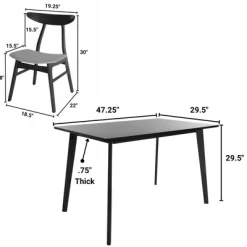 Create a modern dining space with this mid-century five piece dining set. The matching wood finishes and beautiful contemporary design add instant style to any kitchen or dining room. Made from solid rubber wood and MDF with walnut finish, the rectangular table has slightly tapered legs and sleek, minimalist lines. It is the perfect size for relaxing family meals or evening get-togethers. The four solid wood chairs have comfortable, upholstered seats while the ergonomic chair backs feature smooth curves that evoke the mid century sensibility. Perfectly suited for small spaces, this five piece dining set will bring a retro feel to the home. Table measures 47.25″ W x 29.5″ D x 29.5″ H and chairs measure 30″ H x 19.25″ W x 22″ D, and the seat height is 18″. This set is shipped in two boxes, and requires assembly.